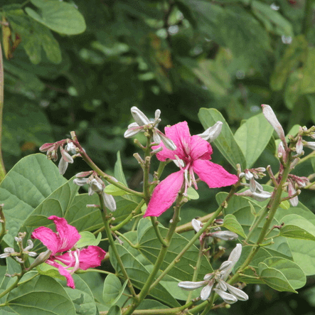 Leaves are dull green, paler beneath, alternately arranged on short branches, butterfly-like segmented into two oval-shaped lobes, each about 10–20 cm long and equally broad, veins are prominent, and radiate from the base. Flowers are conspicuous and attractive, borne as a group at the ends of branches. The colours of the flowers vary among trees from purple, pink, and lavender to reddish-pink. The fruit is a flattened pod about 25-30 cm long with a pointed end containing 12-16 seeds.