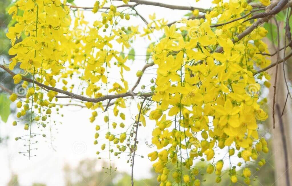 A deciduous tree with spreading branches and a smooth, pale brown trunk. Leaves are compound, 10-60 cm long with 3-8 pairs of leaflets arranged in opposites, including the terminal pair. Leaflets are oval-shaped, smooth and shiny, 6-10 cm long and 3.5-5 cm broad, pointed at both base and tip. Flowers are attractive, bright yellow, borne on pendulous clusters up to 50cm long. Fruits are pendulous, rod-like, up to 75 cm long, blackish-brown, and contain many seeds.